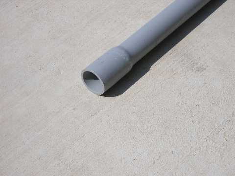 Hoops are 3/4" x 10' long, Grey PVC, electrical conduit pipe. Each hoop is made from two 10' lengths. One end of the pipe is flared to form a socket, the other is straight. Kevin stuck the straight end into the socket end, without glue, to join the two lengths together.